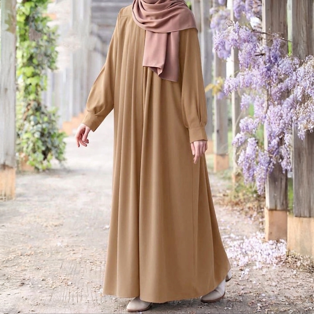 This Camel Earth Abaya is the epitome of understated luxury. The rich tan hue complements various skin tones and pairs perfectly with the included mauve-toned hijab. Featuring a gentle pleated bodice that flows into a wide-sweep skirt, it offers complete coverage without sacrificing style. Ideal for morning errands, work, or casual social gatherings.