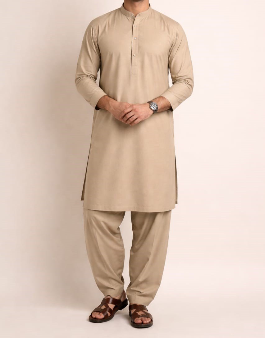 This Classic Beige Men’s Shalwar Kameez is designed for men who appreciate both comfort and traditional style. Made with premium quality fabric, it offers a smooth and breathable feel, making it ideal for long wear throughout the day.