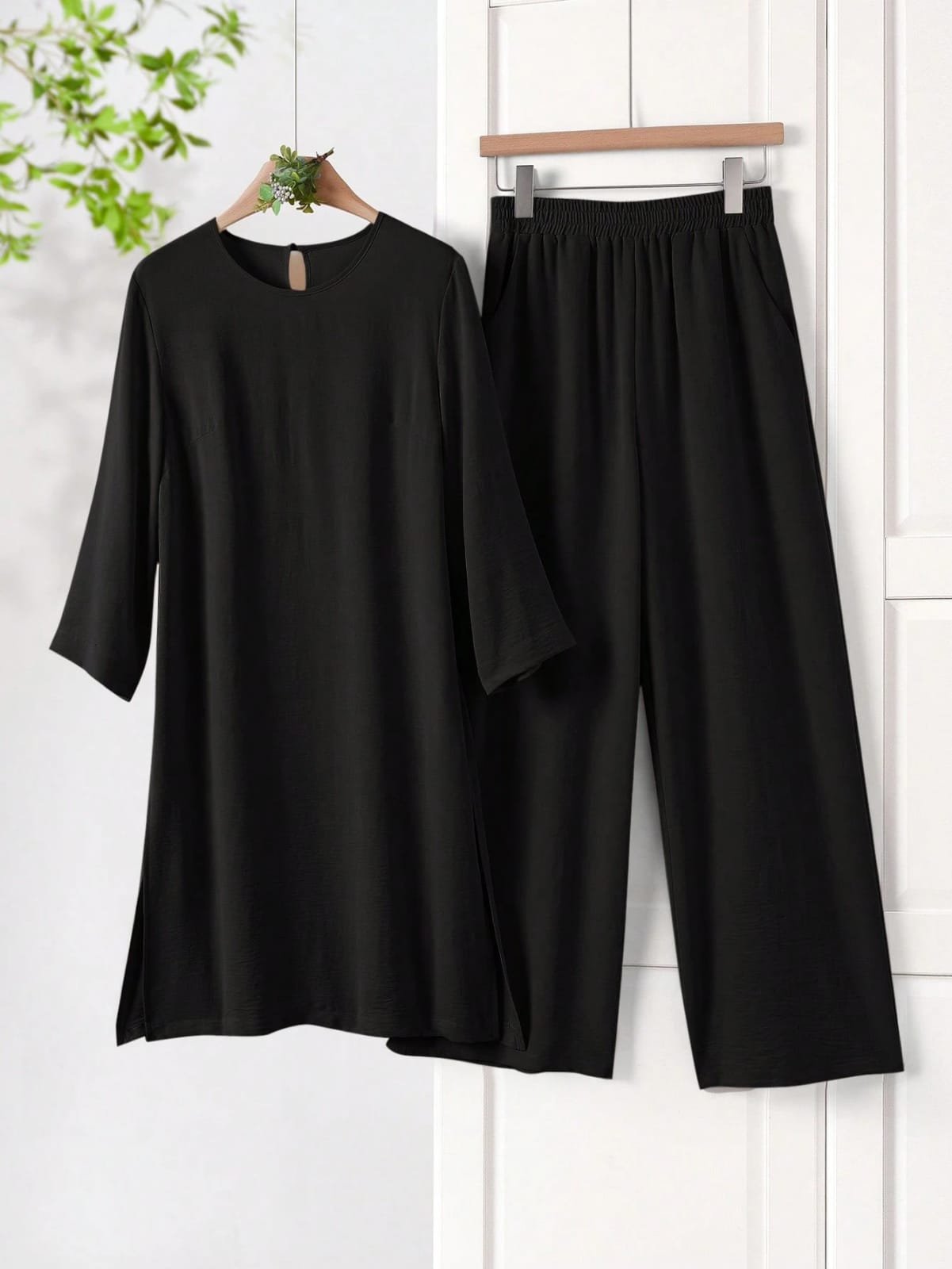 The top features a minimalist round neckline with a subtle back keyhole detail, adding a touch of elegance to its simple design. Its loose, flowy fit and three-quarter sleeves provide ease of movement and a flattering silhouette.