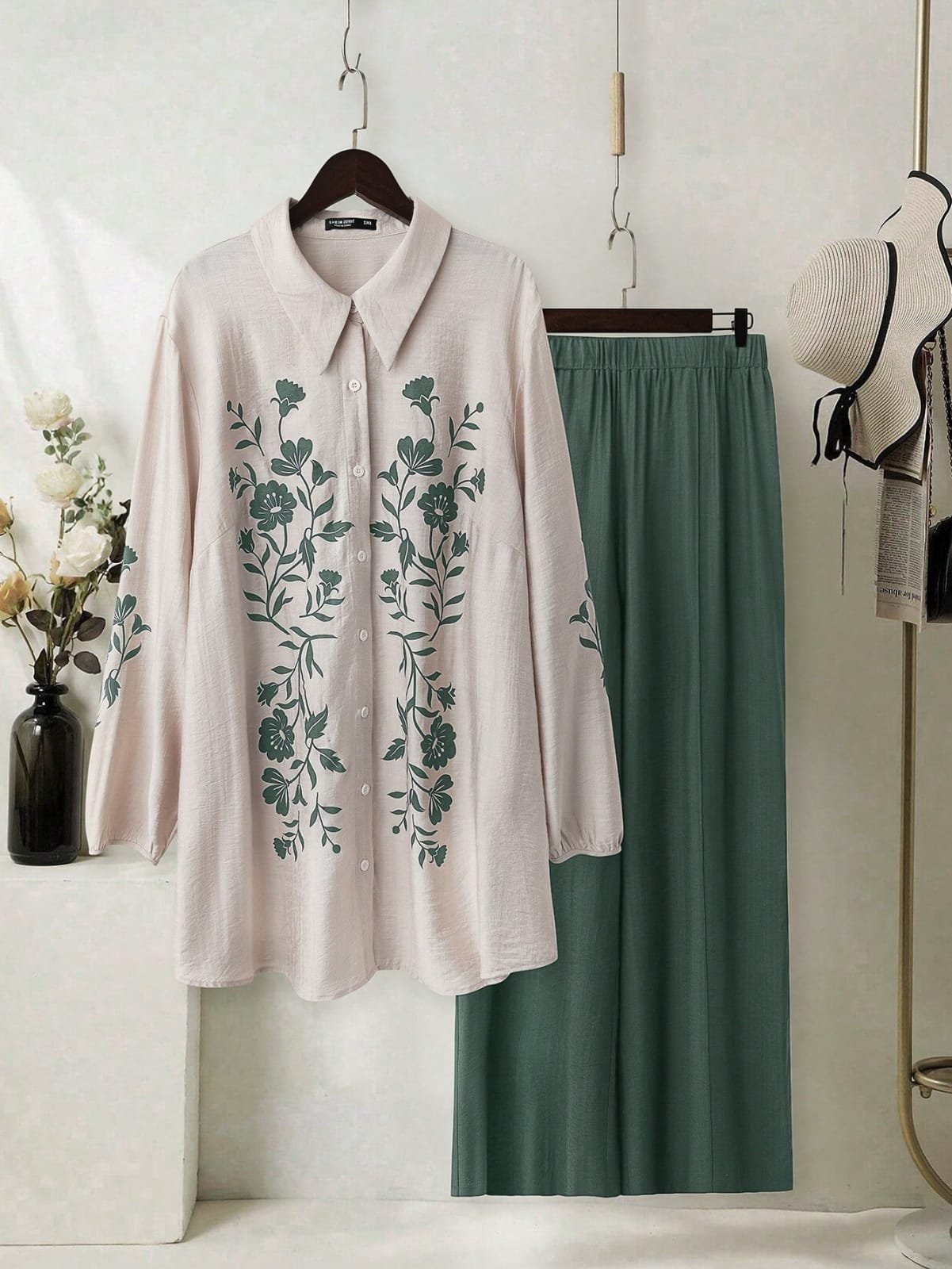 Paired with a matching solid green skirt, designed with a comfortable elastic waistband, this outfit offers a perfect balance of style and ease. The skirt flows gracefully, creating a flattering silhouette suitable for various body types.