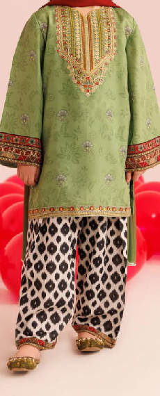 Brighten up any festive occasion with this cheerful Mustard Radiance set. The shirt is adorned with delicate pink and white floral embroidery along the neckline and hem, accented by stylish magenta potli buttons. Paired with comfortable wide-leg lawn trousers featuring a vintage floral block print and a soft contrast dupatta, this outfit combines traditional charm with modern comfort for young girls.