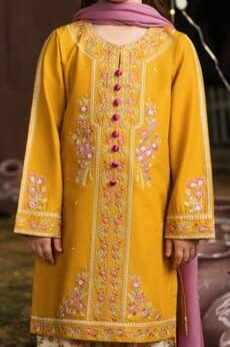 Sophistication meets playfulness in this Sage Garden ensemble. The soft green shirt features a classic V-shaped embroidered neckline with rich earthy tones. It is paired with striking Ikat-style printed baggy trousers that offer both style and ease of movement. The look is completed with a deep maroon dupatta, making it a perfect choice for evening events and festive celebrations.